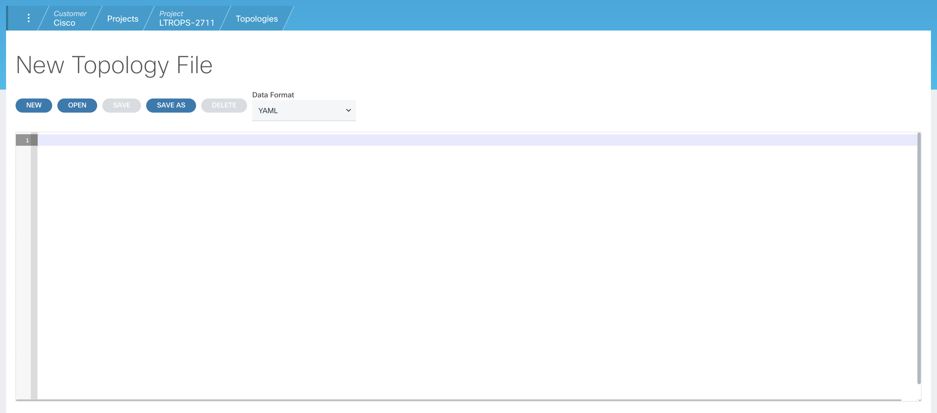 Upon navigating to Topologies, you will see a blank topology file. If you had a pre-existing topology, you could open it using the Open button.