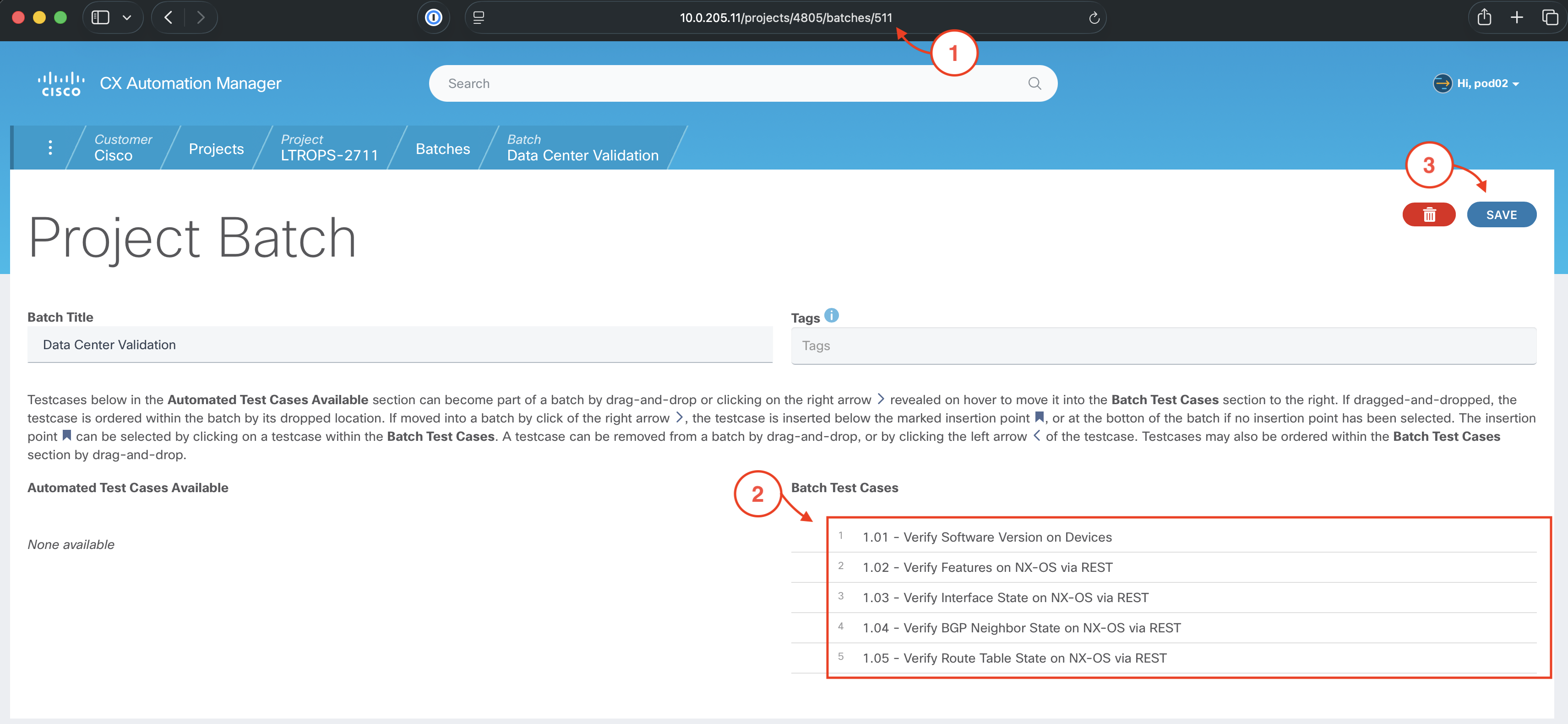 Collect the batch ID for the Data Center Validation batch directly from the URL ("511" in this example), and save
