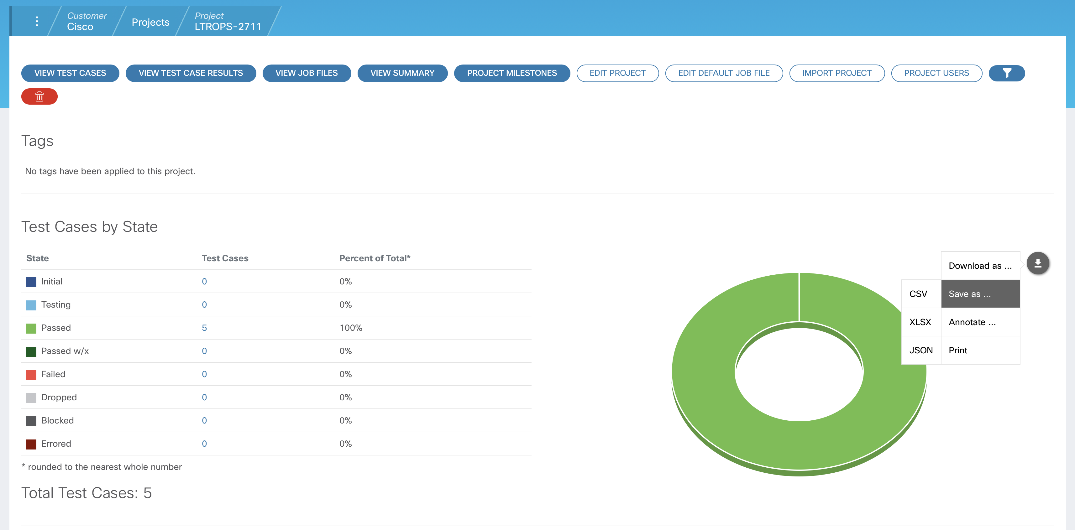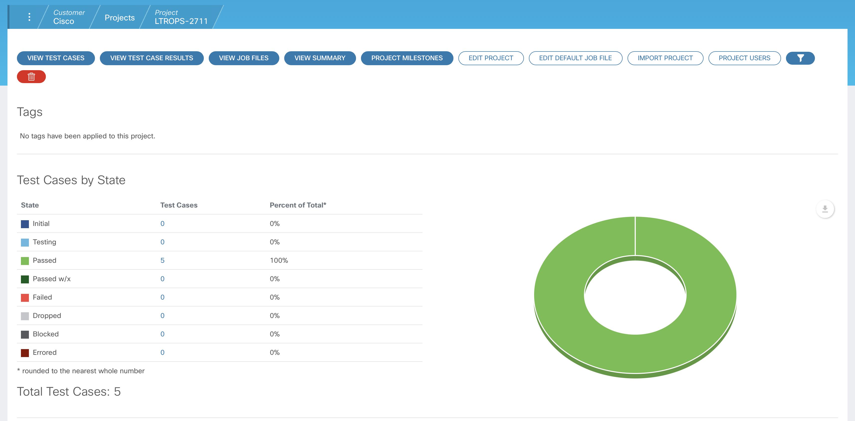 Now that all of the test cases have been executed, your project dashboard should reflect all test cases in the "Passed" state.