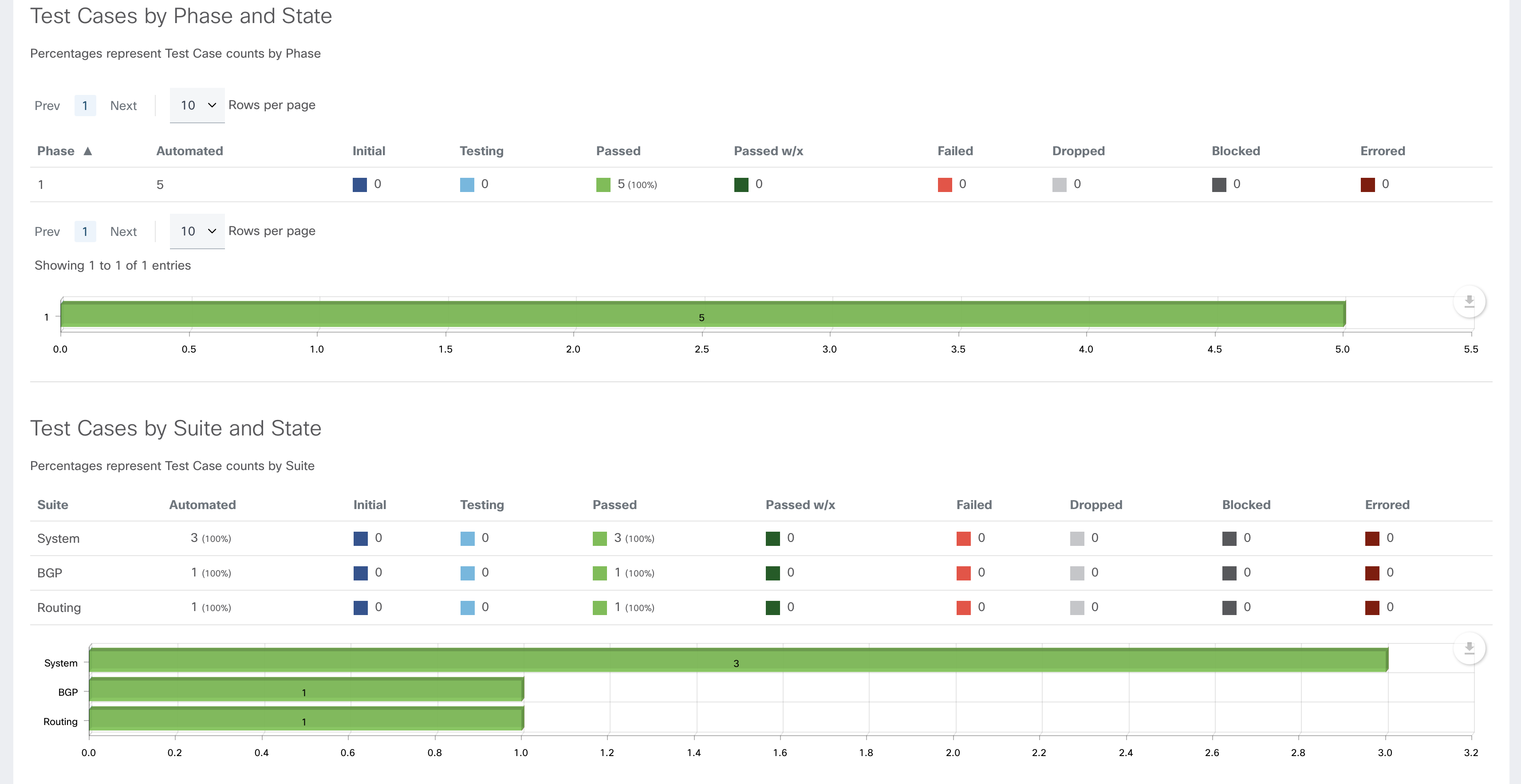 Review the Test Cases by Phase and State and the Test Cases by Suite and State charts.