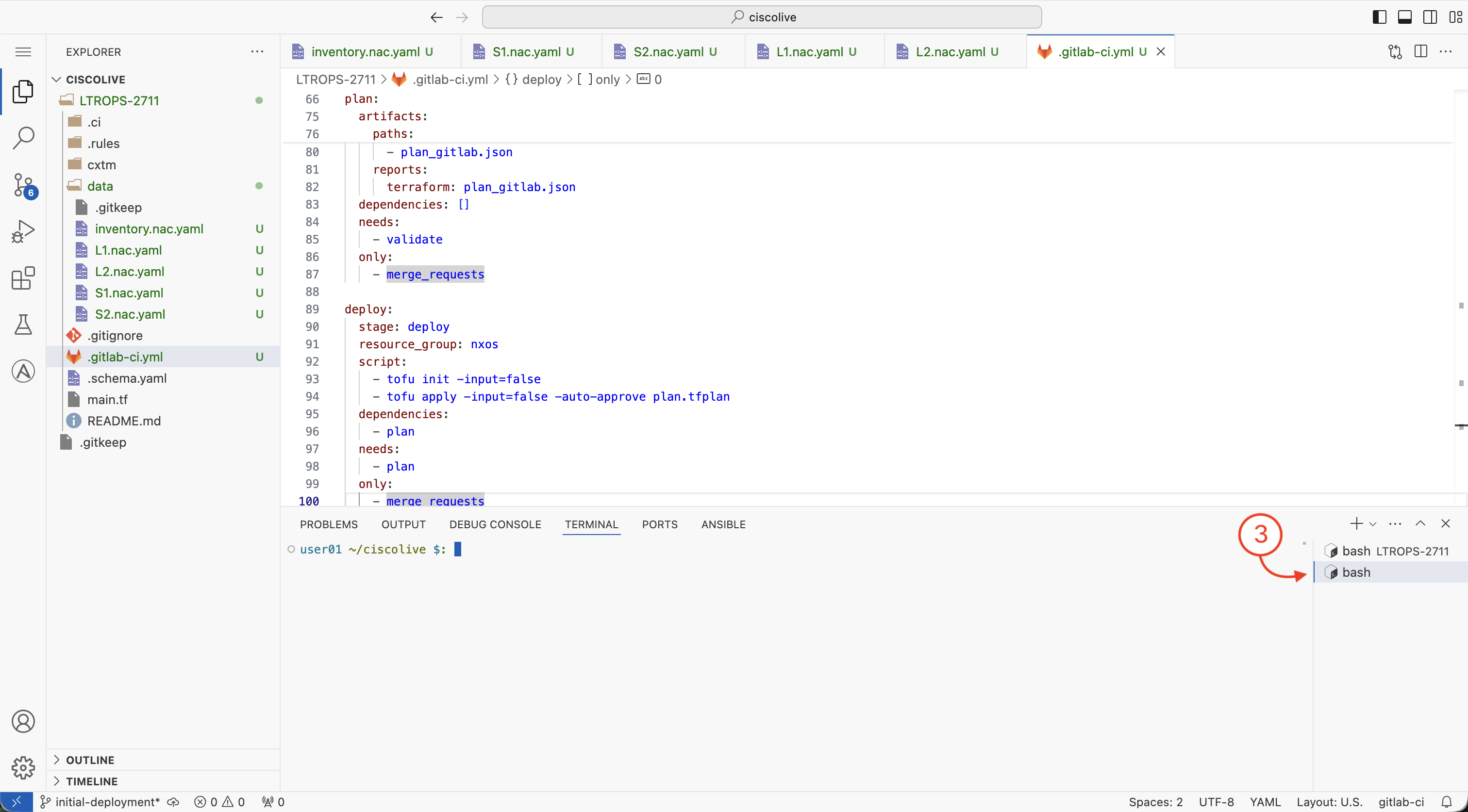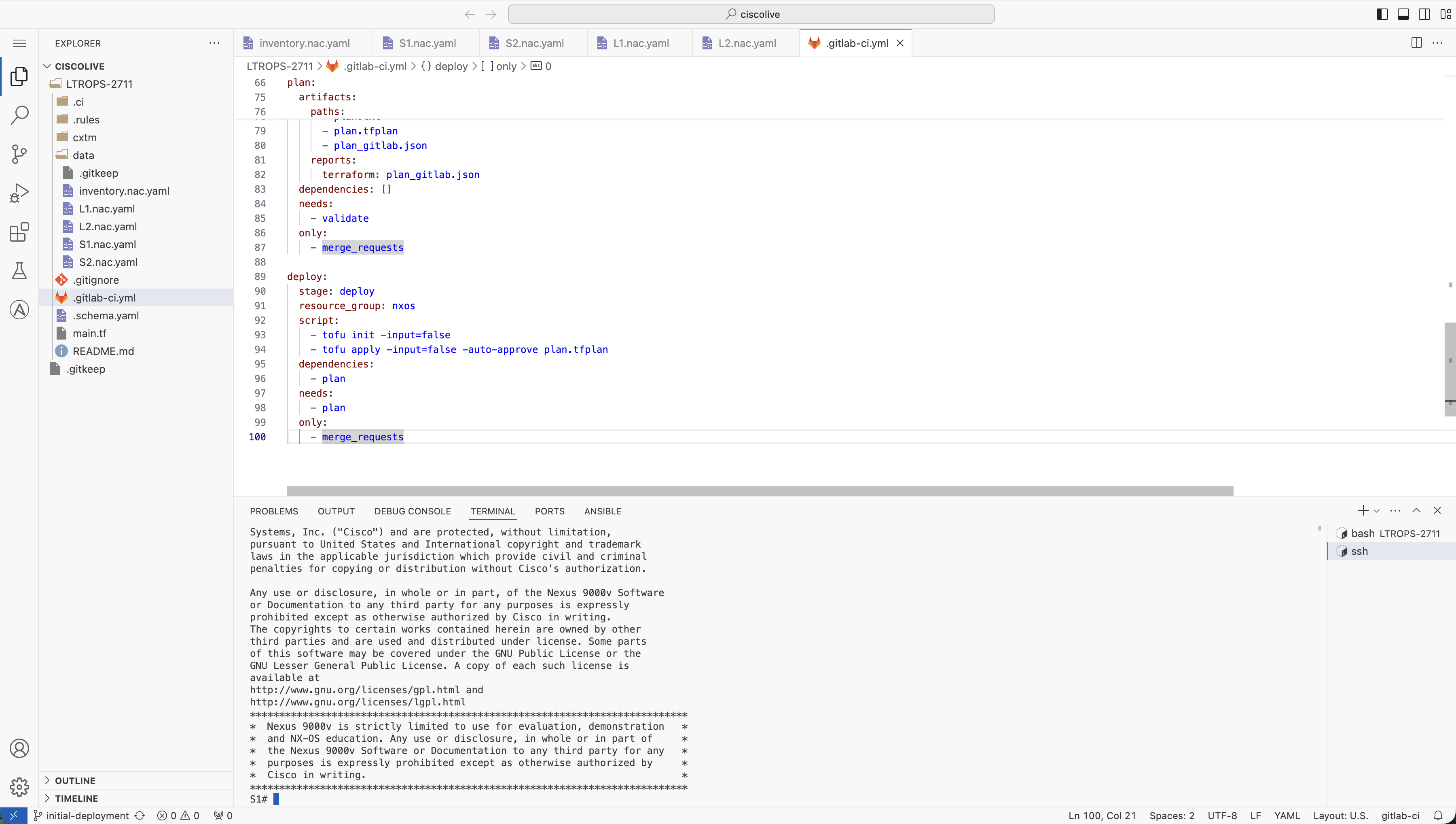 After the GitLab CI/CD pipeline has successfully deployed the configurations to your Nexus fabric, it's important to manually verify that the configuration changes have been applied correctly to each device. In this section, you will connect to the Nexus switches and validate the deployed configurations.